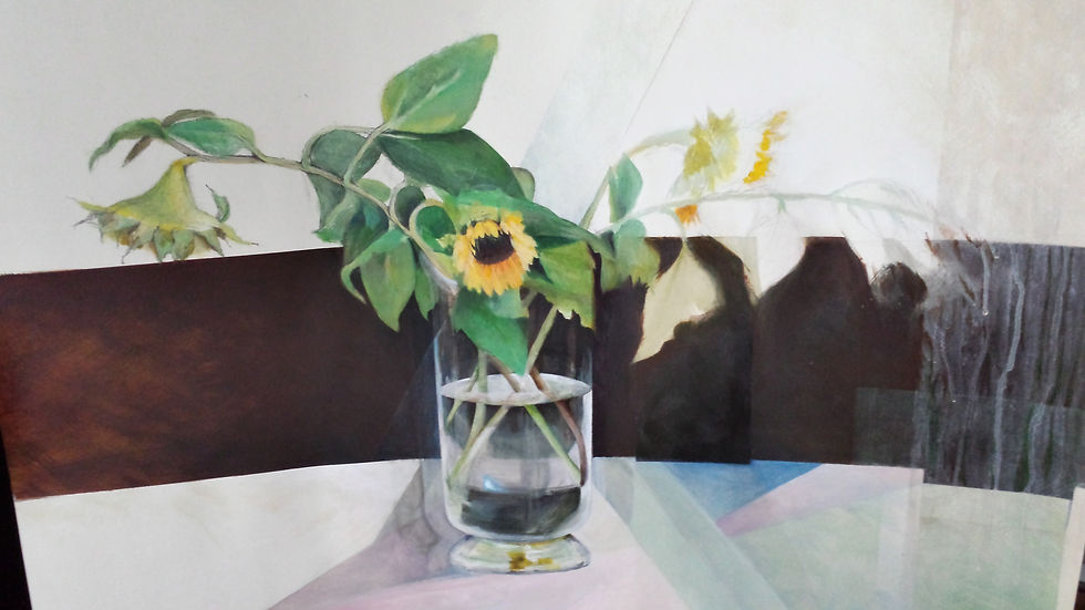 In een glazen vaas waren er enkele zonnebloemen gezet... een beetje verwelkt, wat brak en groenig water, tussen wat rommel hier en daar geplaatst, eenzaam en verlaten... "Maak er maar iets van!", luidde de eerste opdracht. Euch, hè...,?!? En het schilderen begon... Maar de volgende opdracht is ook vastgelegd. Ik mag een stierenkop schilderen... in het groot :-)